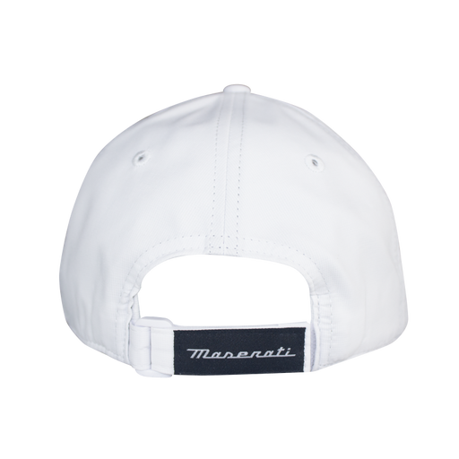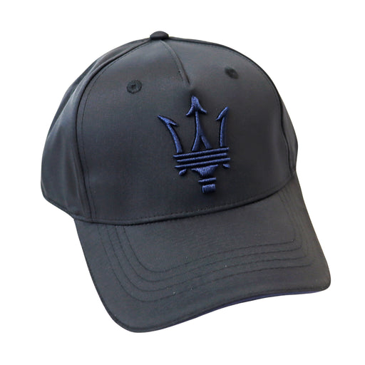 Maserati black cap Embroidered blue trident in center of front Adjustable black Velcro back strap Maserati script across back strap 3D blue meta...