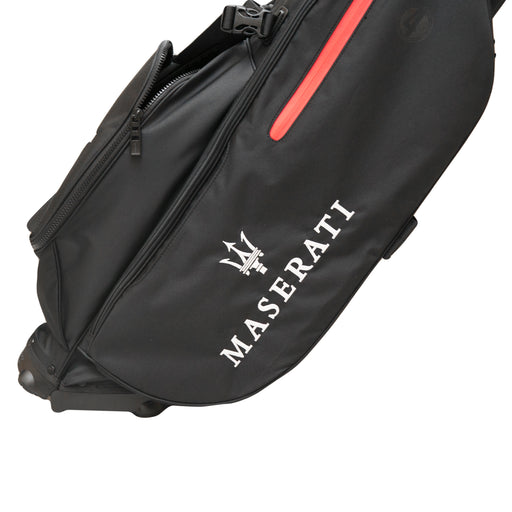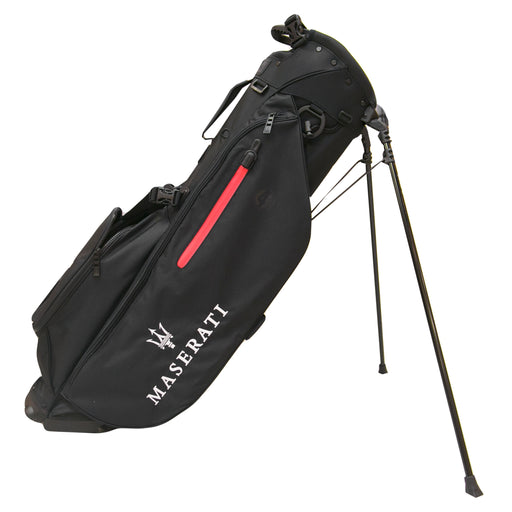 Black golf bag with large Maserati logo across side High-grade aluminum legs and an advanced hinged bottom for best-in-class stability Self-balanc...