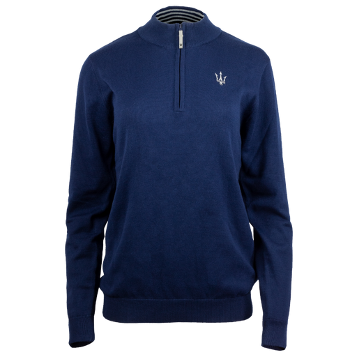Blue Maserati sweater Made of 50% cotton / 50% acrylic, 12 gauge Navy Blue body with mock neck and inner collar contrast stripe detail Grey silico...
