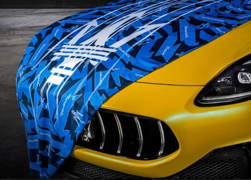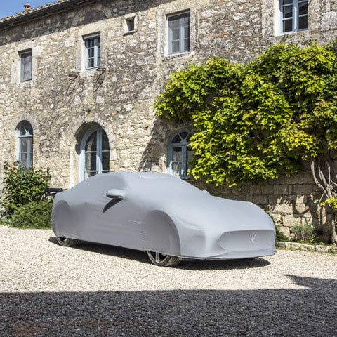 The indoor car cover, featuring the repetition of the logo to form an iconic pattern, embellished by the white Trident on the bonnet and the Grecal...