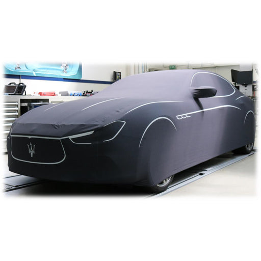 Blue indoor car cover fits the Ghibli Protects cars from dust that are stored in a garage or indoors Made-to-measure using a quality anti-ladderin...