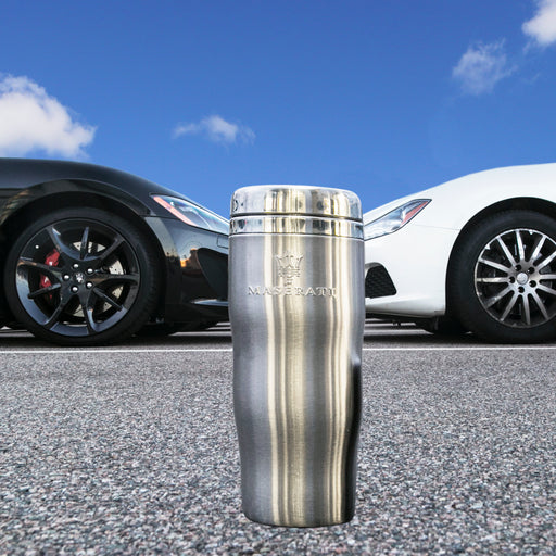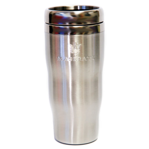 Silver stainless steel mug Insulated liner and spill proof lid Tone on tone Maserati logo embossed on front of mug Hand wash only Do not put in m...