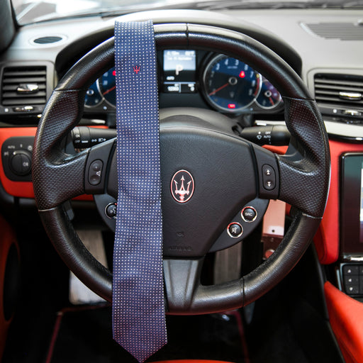 Men's blue tie with micro design 100% genuine jacquard silk White dotted micro design pattern on blue tie Embroidered red trident in center of tie...