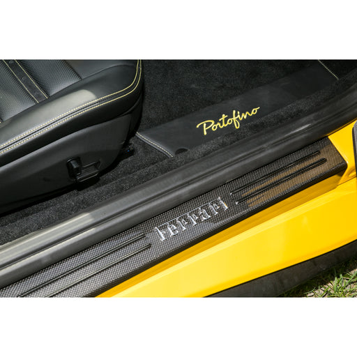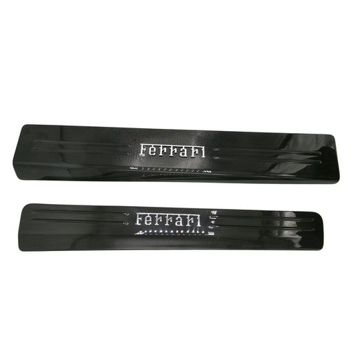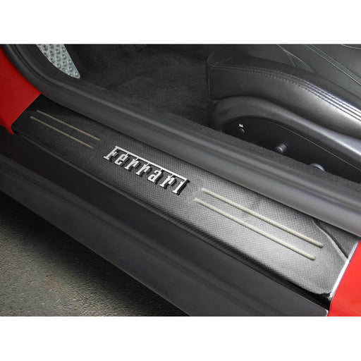 Ferrari black carbon fiber group sill plates Fits Ferrari F12 models Silver metal enameled Ferrari script in center of front Dual raised carbon fi...