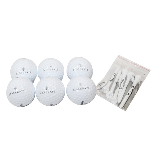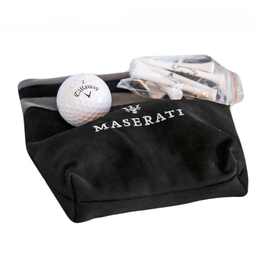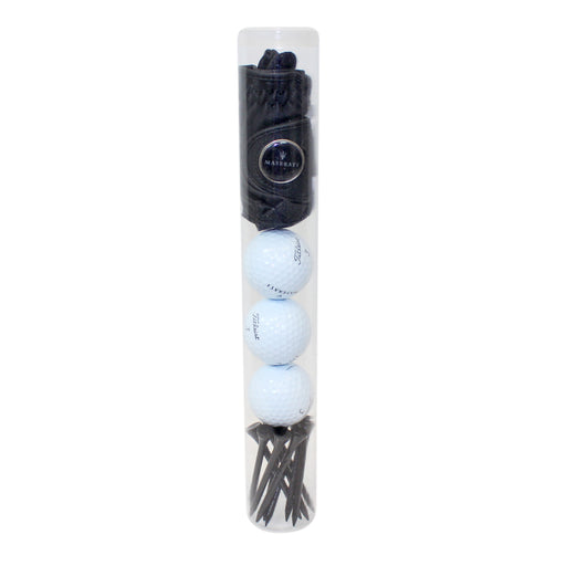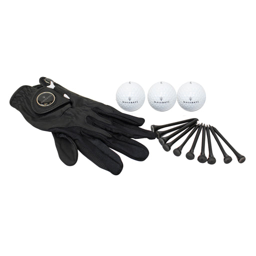 Pack of golf accessories Comes with golf glove, tees, and balls Black glove with Maserati insignia 10 black tees 3 white Maserati Titleist golf ba...