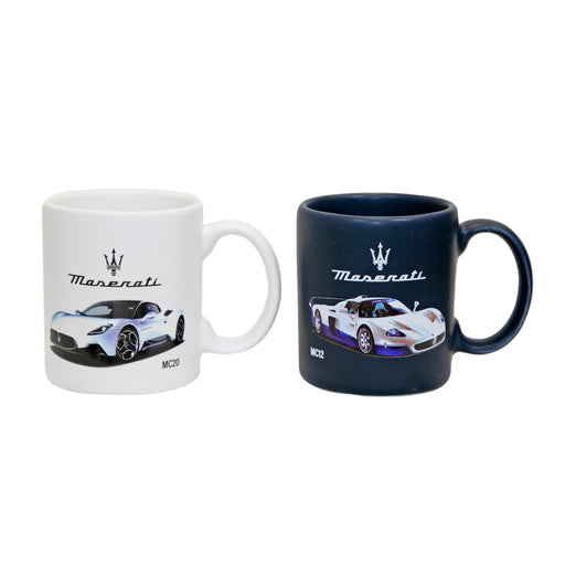 Set of 2 Maserati mugs One white mug with Maserati MC20 graphic on front and black Maserati logo One blue mug with Maserati MC12 graphic on front ...
