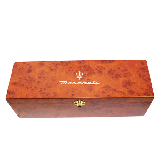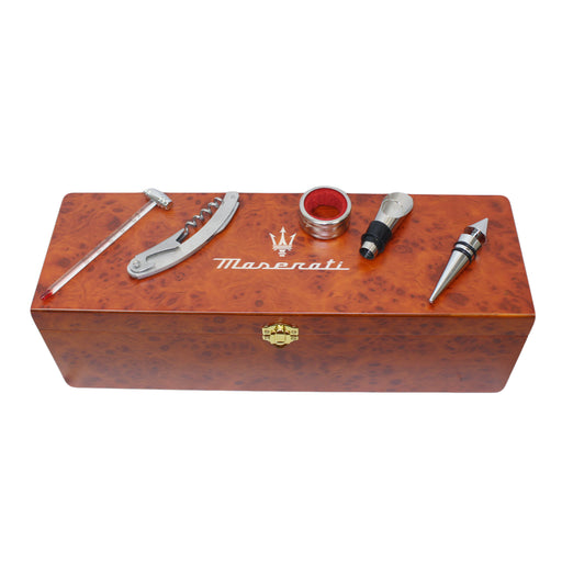 Maserati brown wine bottle holder box Comes with 5-piece tool set Brown box is in rosewood finish Box has gold clasp that holds lid down ...